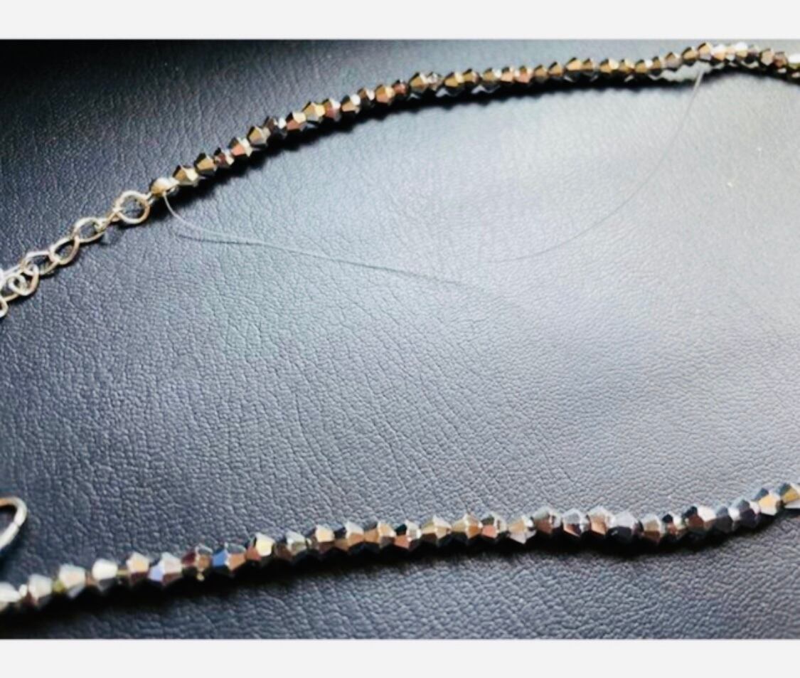 六角形のビーズを使用しており、独特の輝きとカラフルな色合いが特徴です。