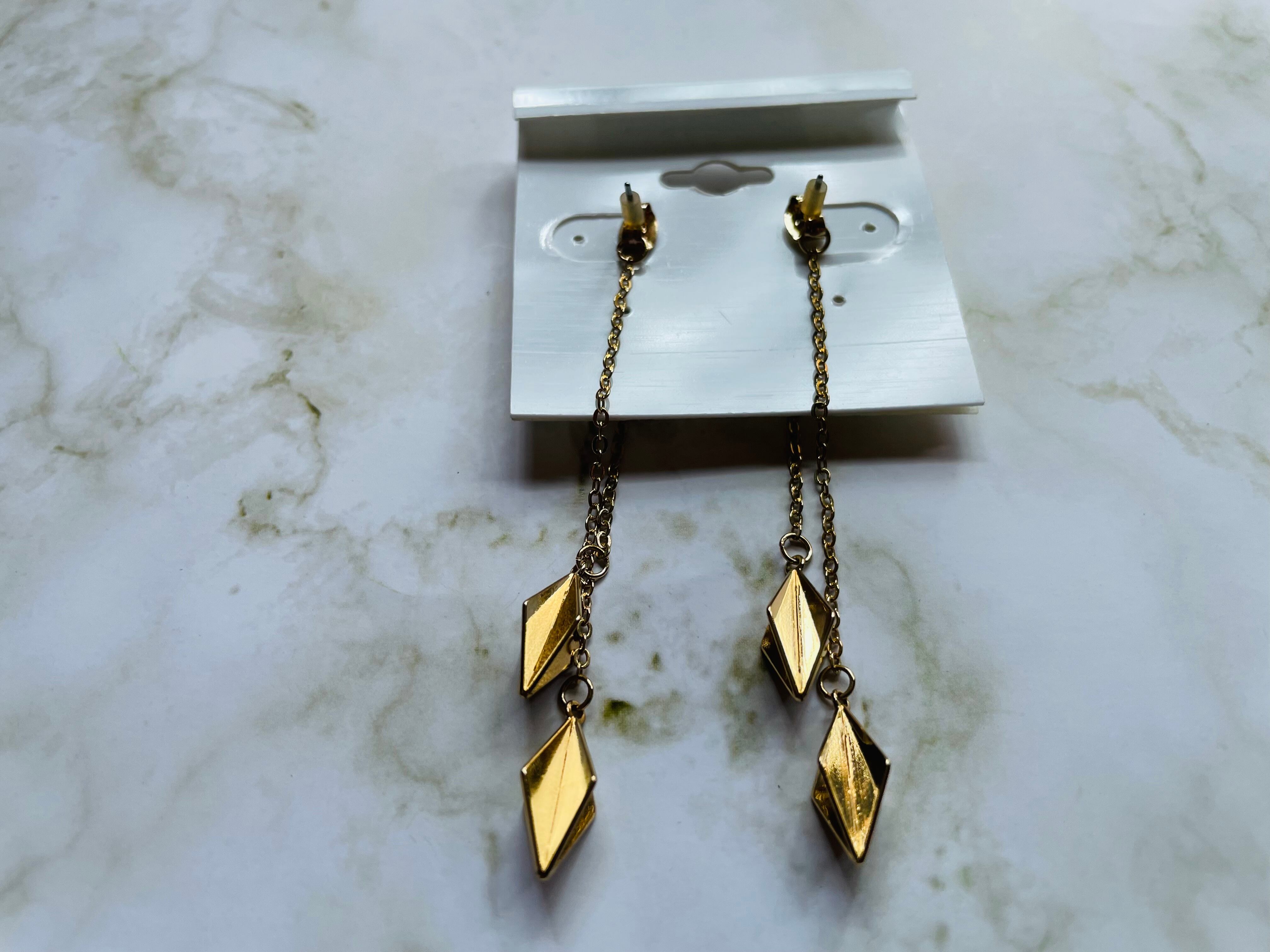 ダイヤモンド型のチャームが特徴的で、シンプルながらも存在感のあるロングピアスです。